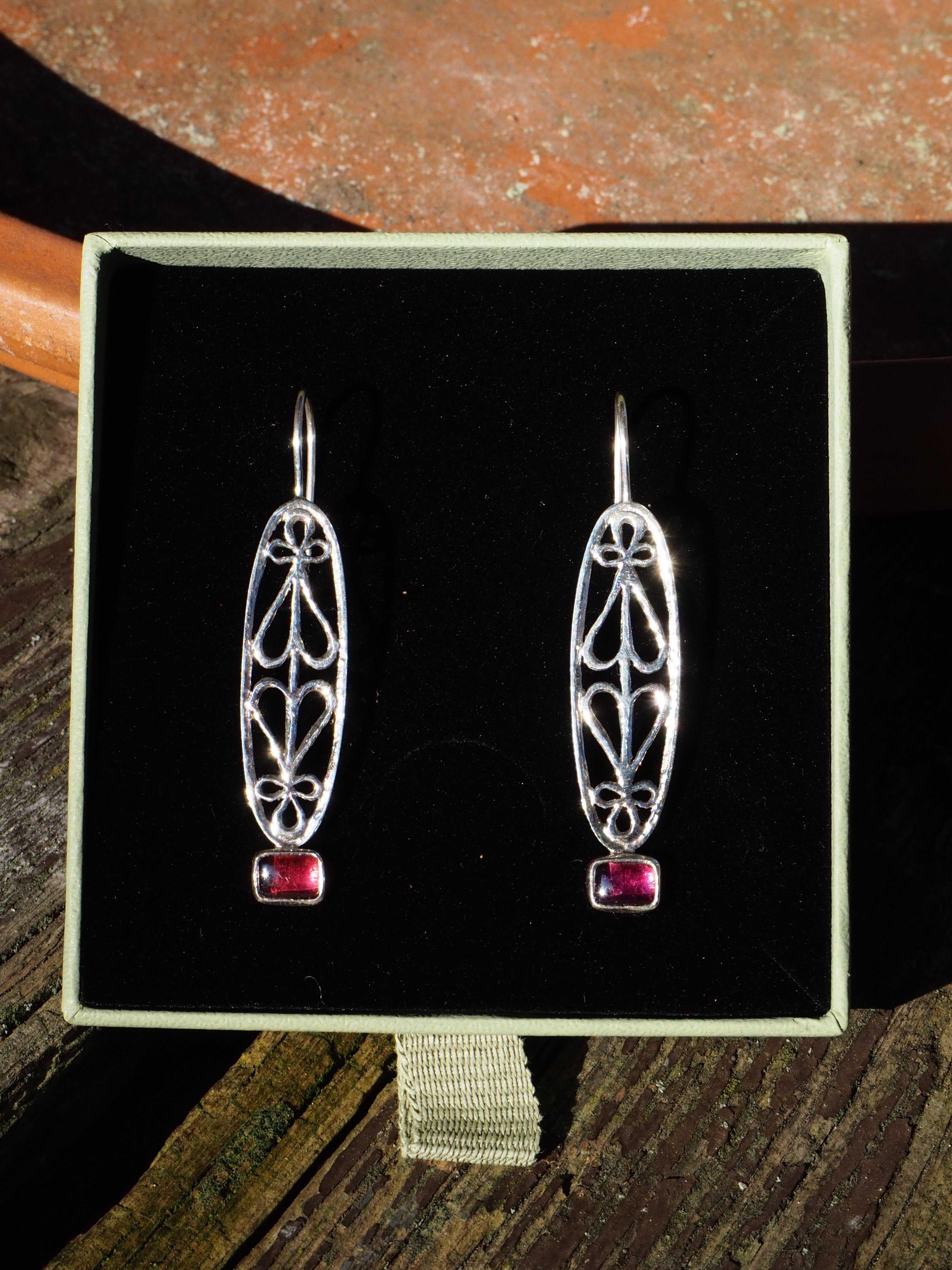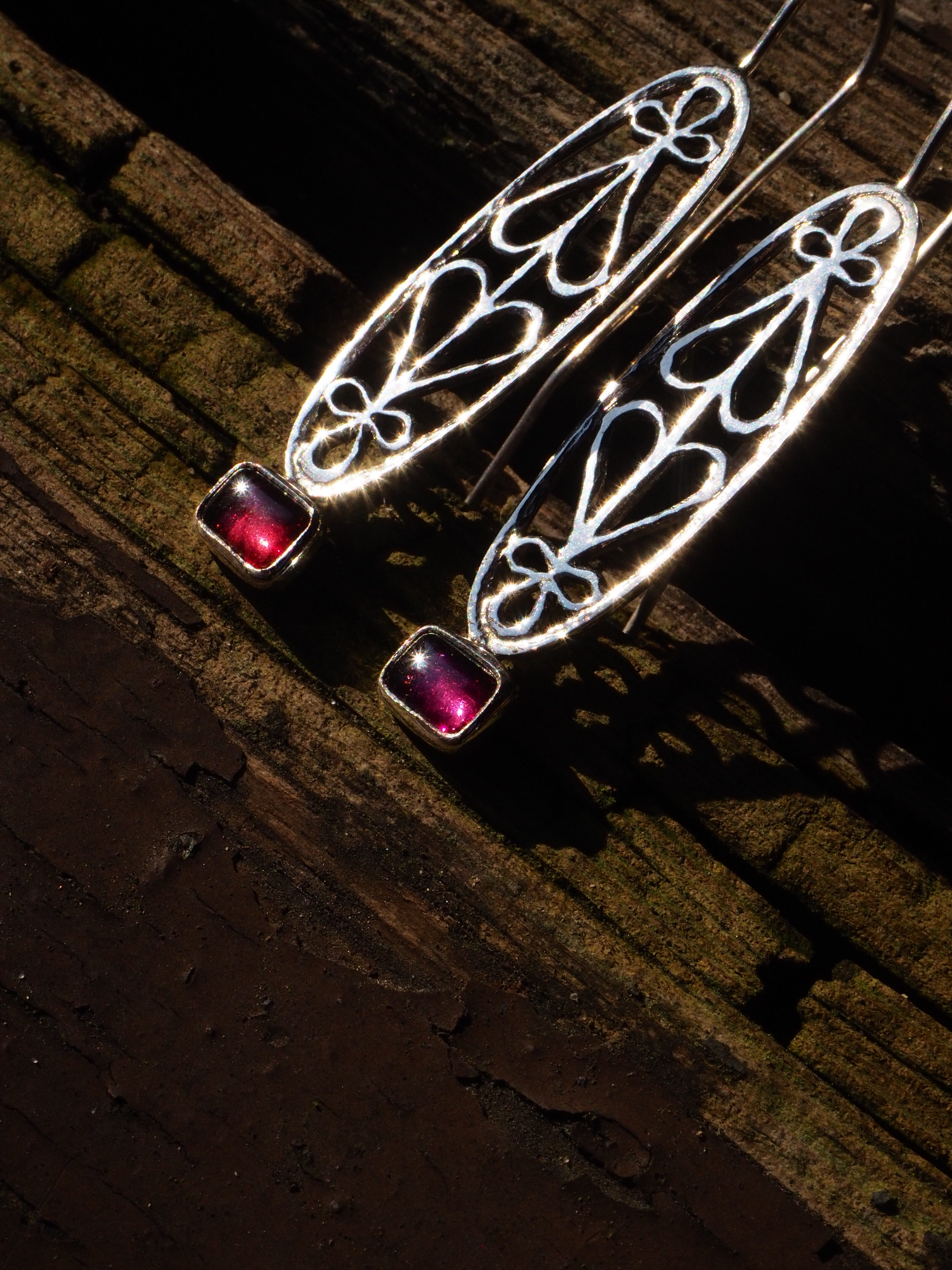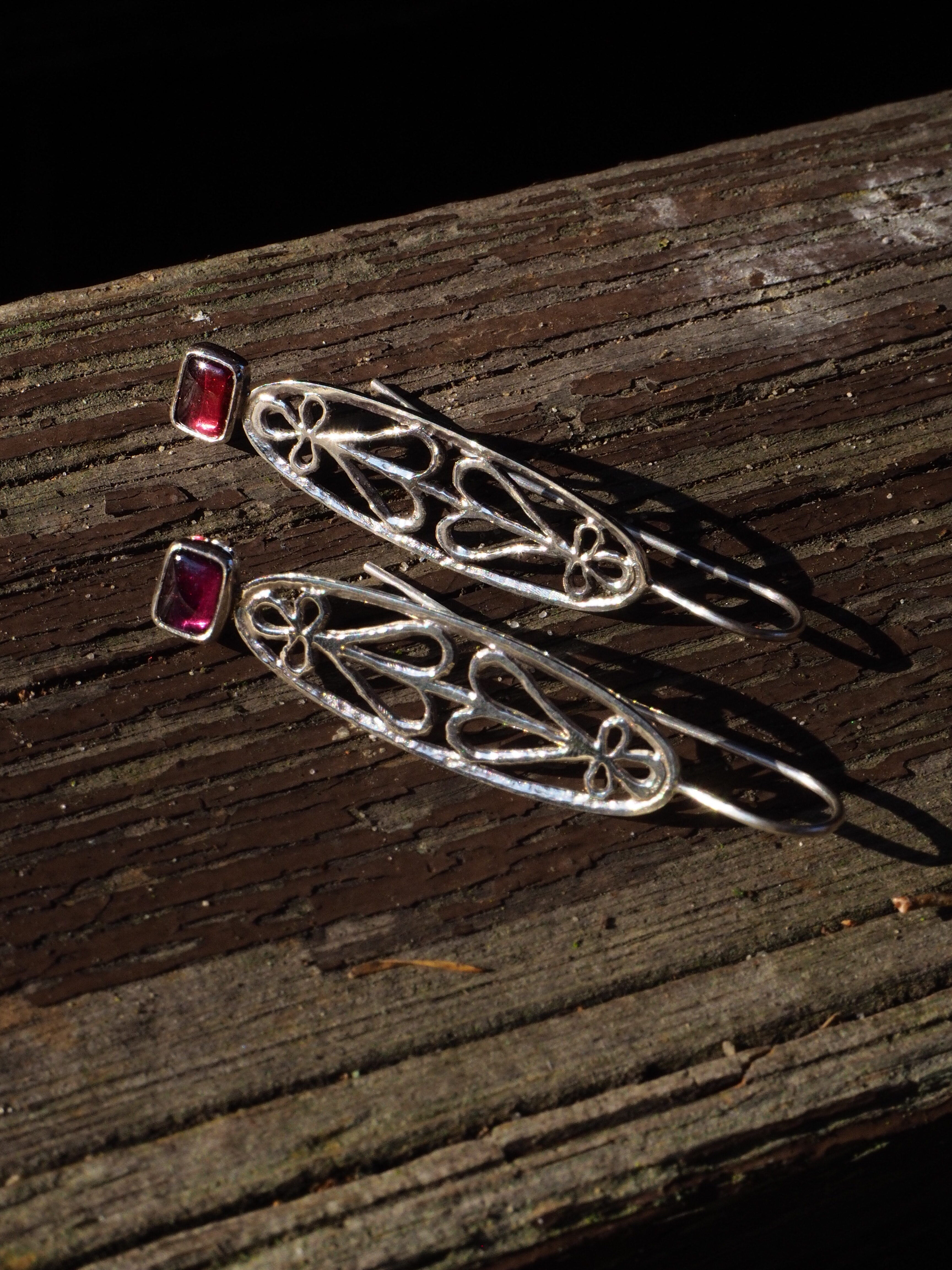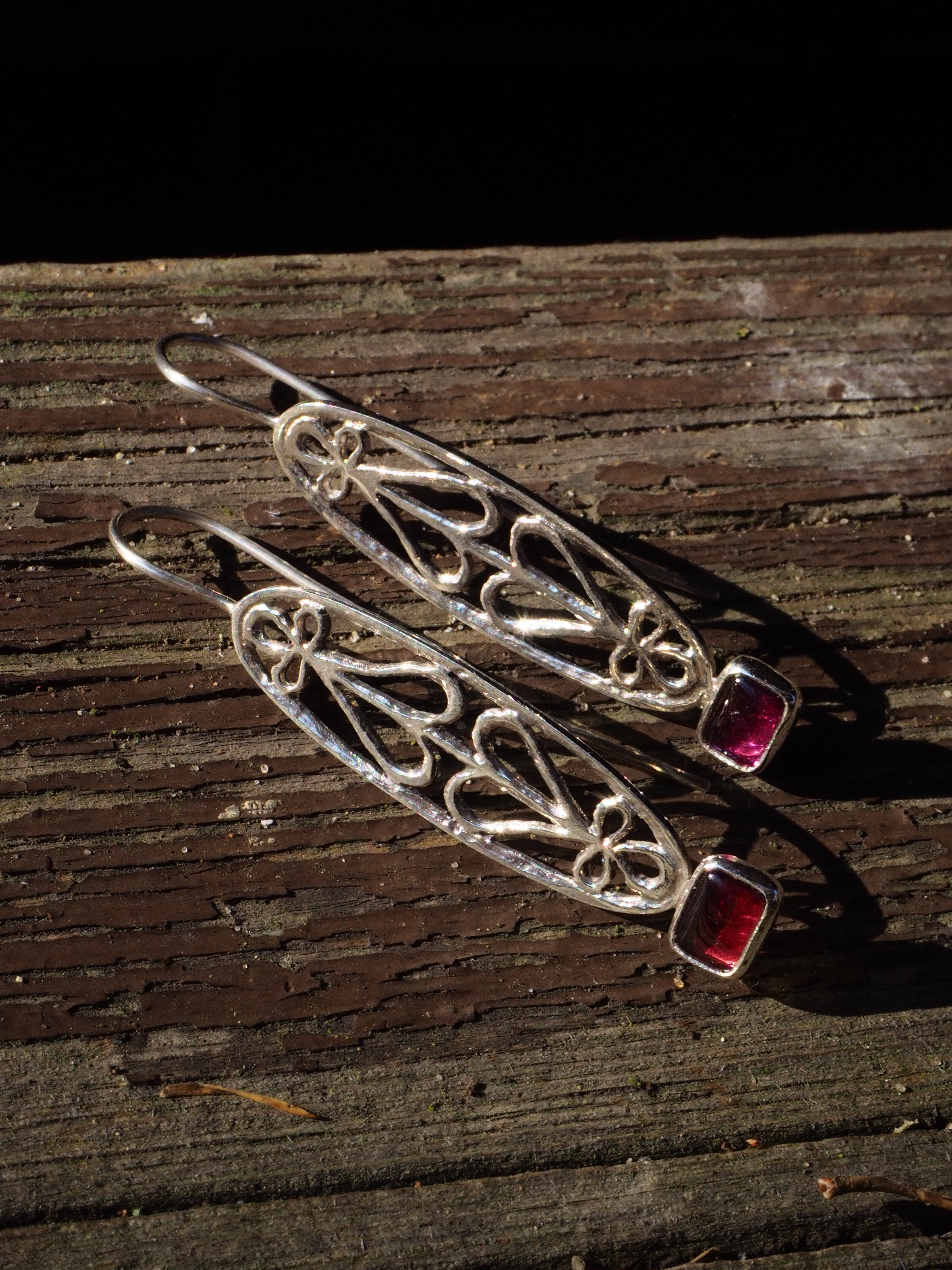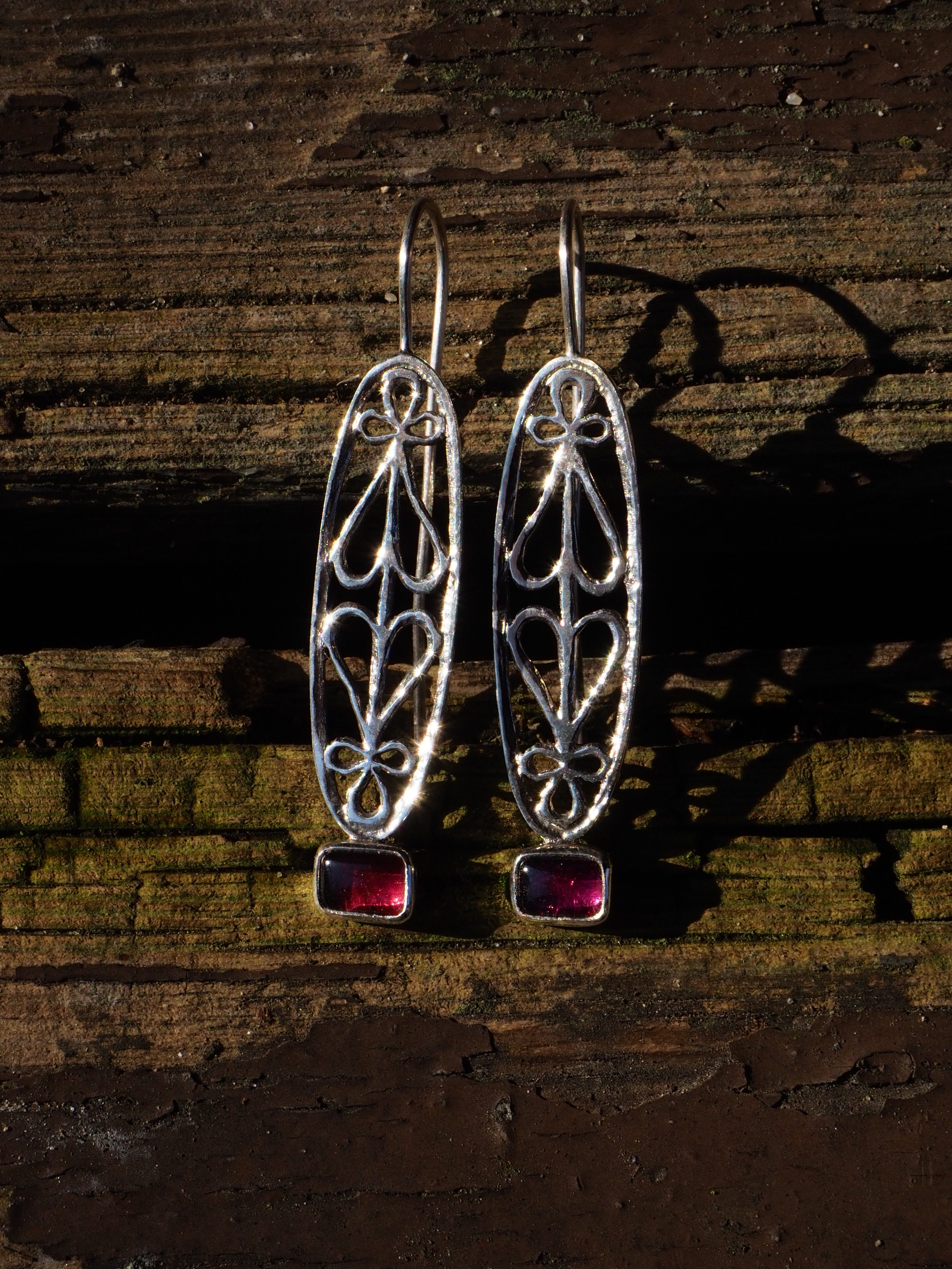 Kolczyki wykonane ręcznie ze srebra próby 925 z gładkimi, soczystymi granatami. Ażurowy motyw odwróconych od siebie serc. Bigle otwarte, długie, bardzo wygodne w noszeniu. Długość kolczyków – 5,4 cm. Wielkość kamieni – 6 x 8 mm.