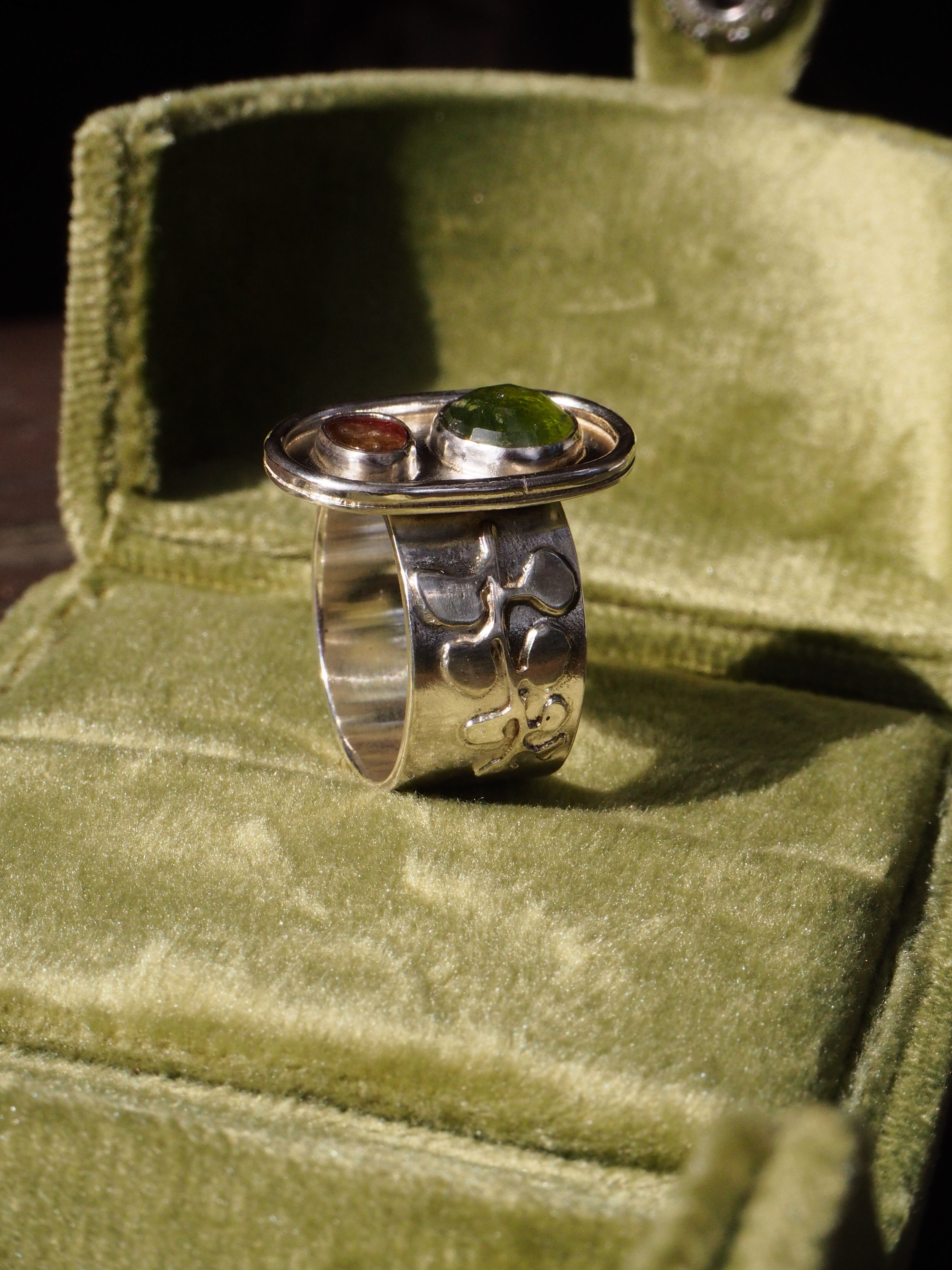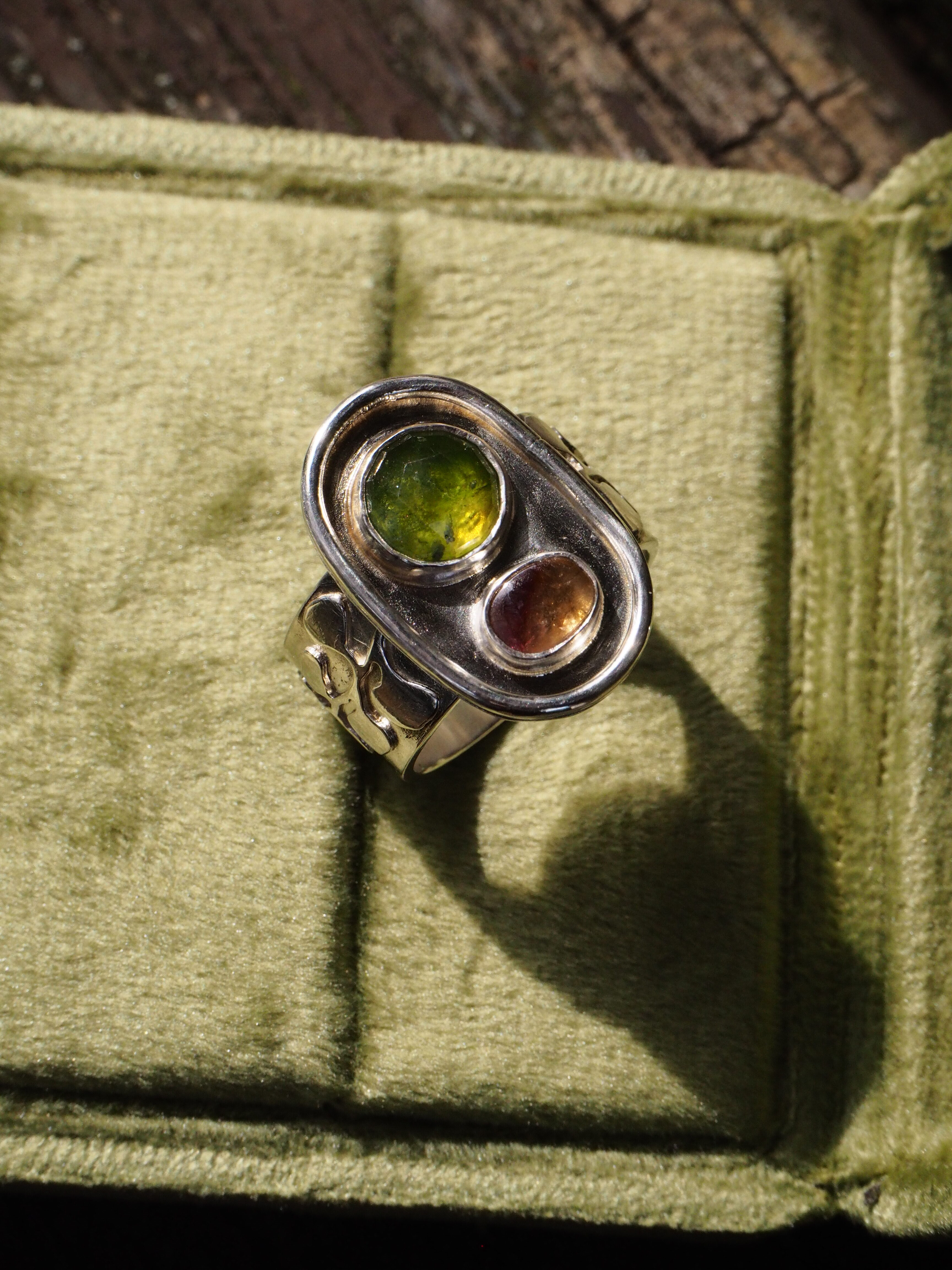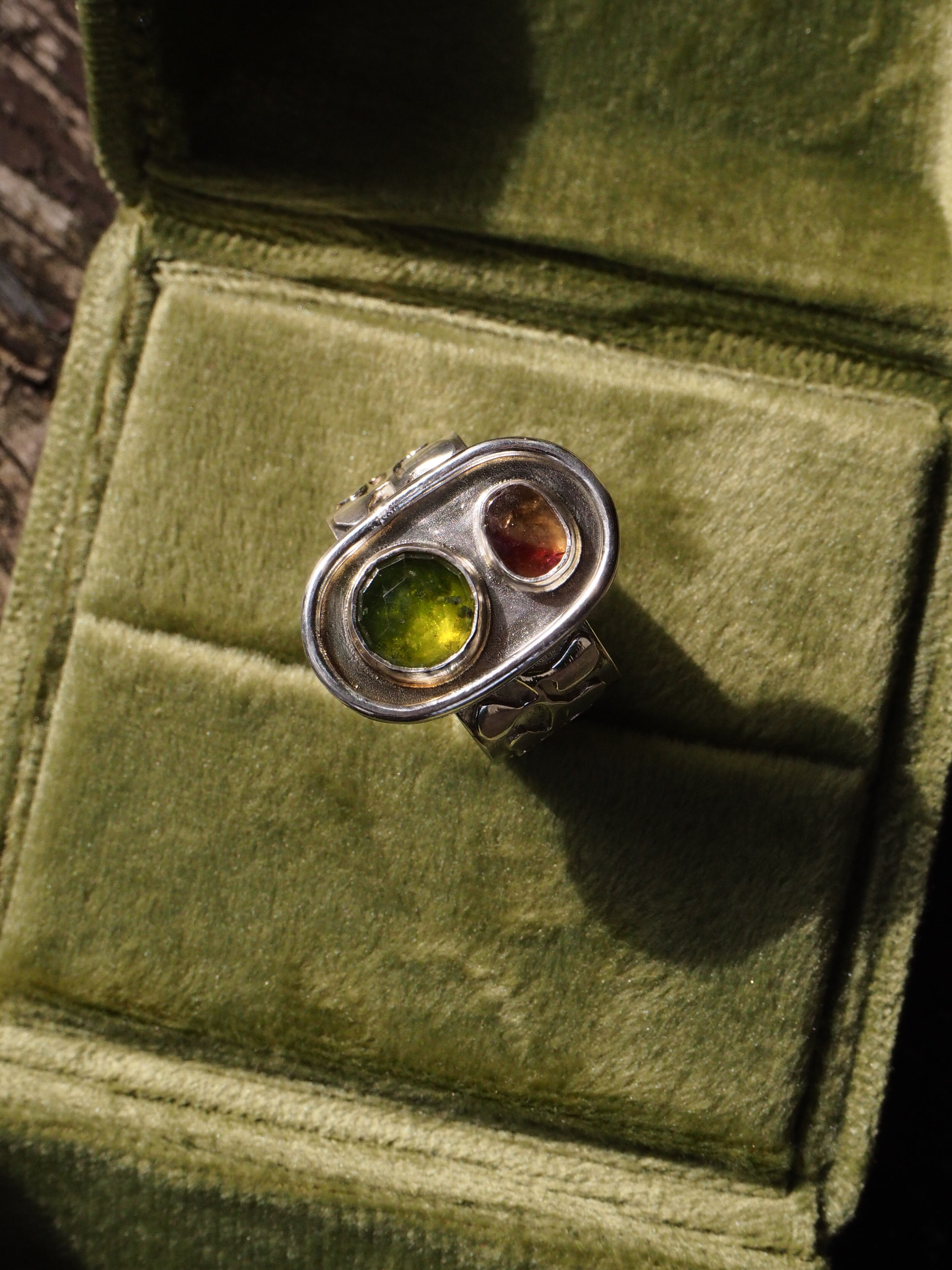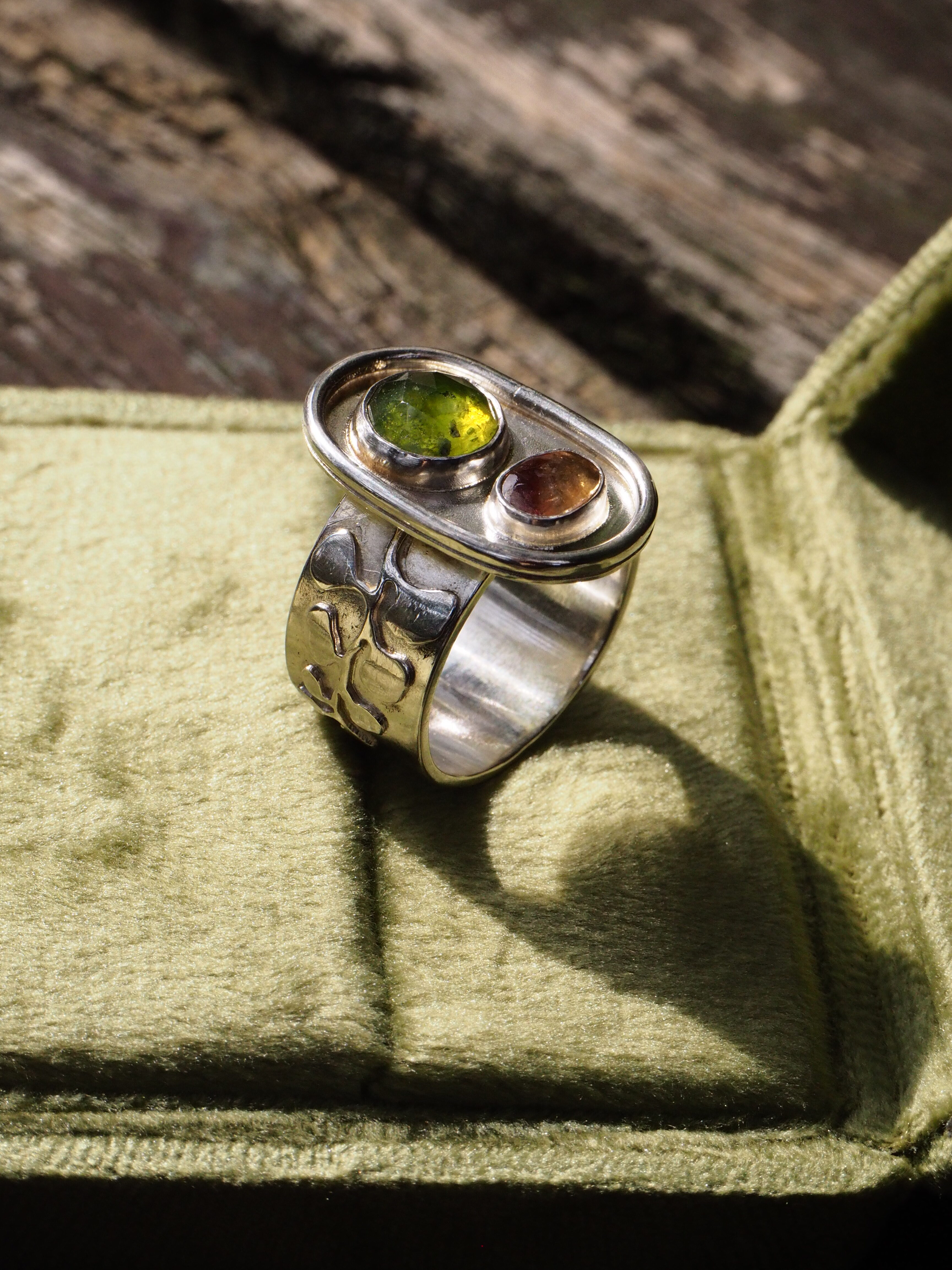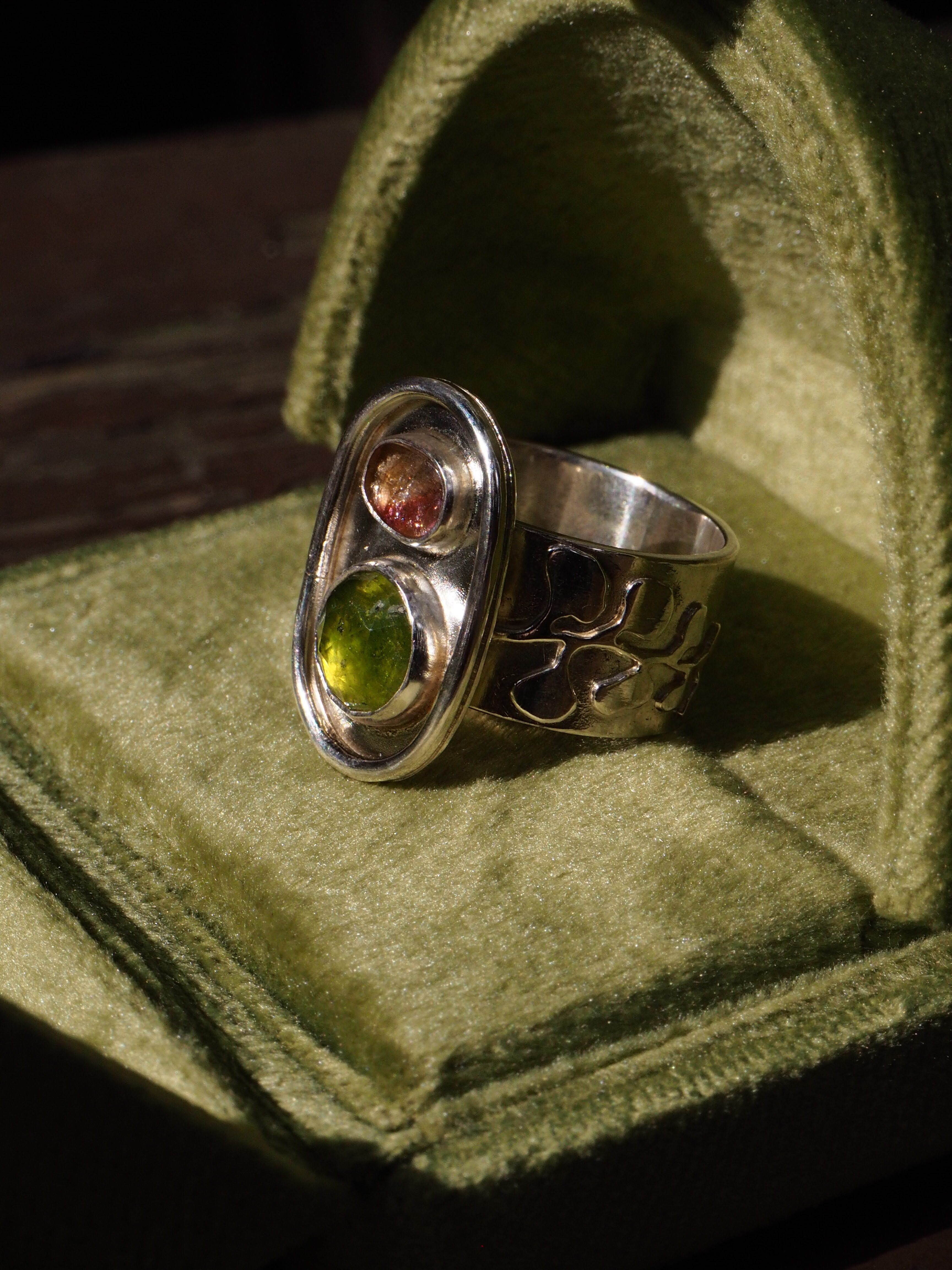 Ręcznie wykonany pierścionek ze srebra 925 z dwoma kamieniami: fasetowanym, okrągłym vesonitem o intensywnej, zielonej barwie oraz owalnym turmalinem o ciepłym, wielobarwnym odcieniu. Zestawienie kamieni tworzy wyraźny, naturalny kontrast kolorystyczny, charakterystyczny dla obu minerałów — vesonit o szklistym połysku i głębi barwy oraz turmalin znany z subtelnych odcieni, tutaj z wybijającym się różem.