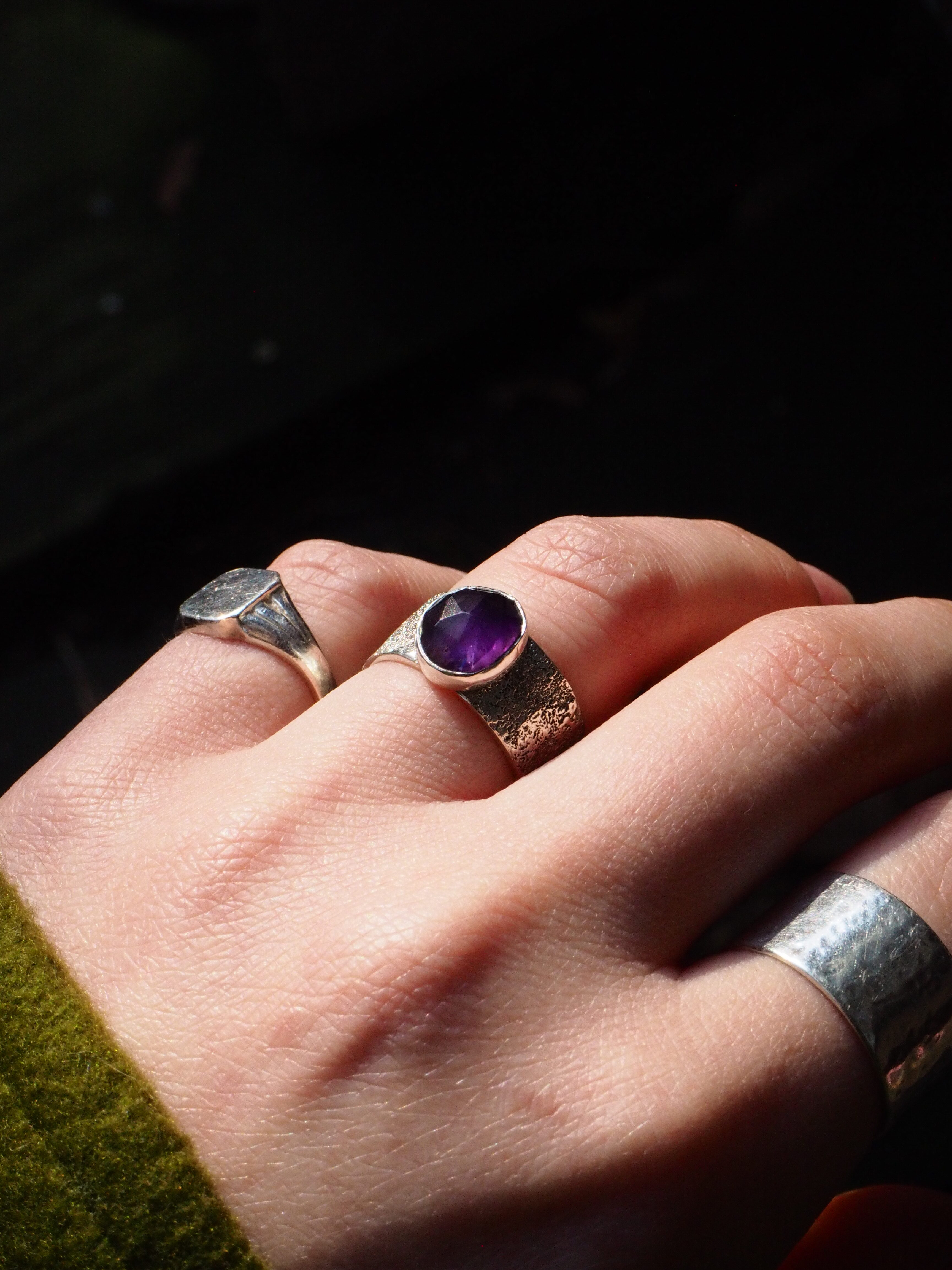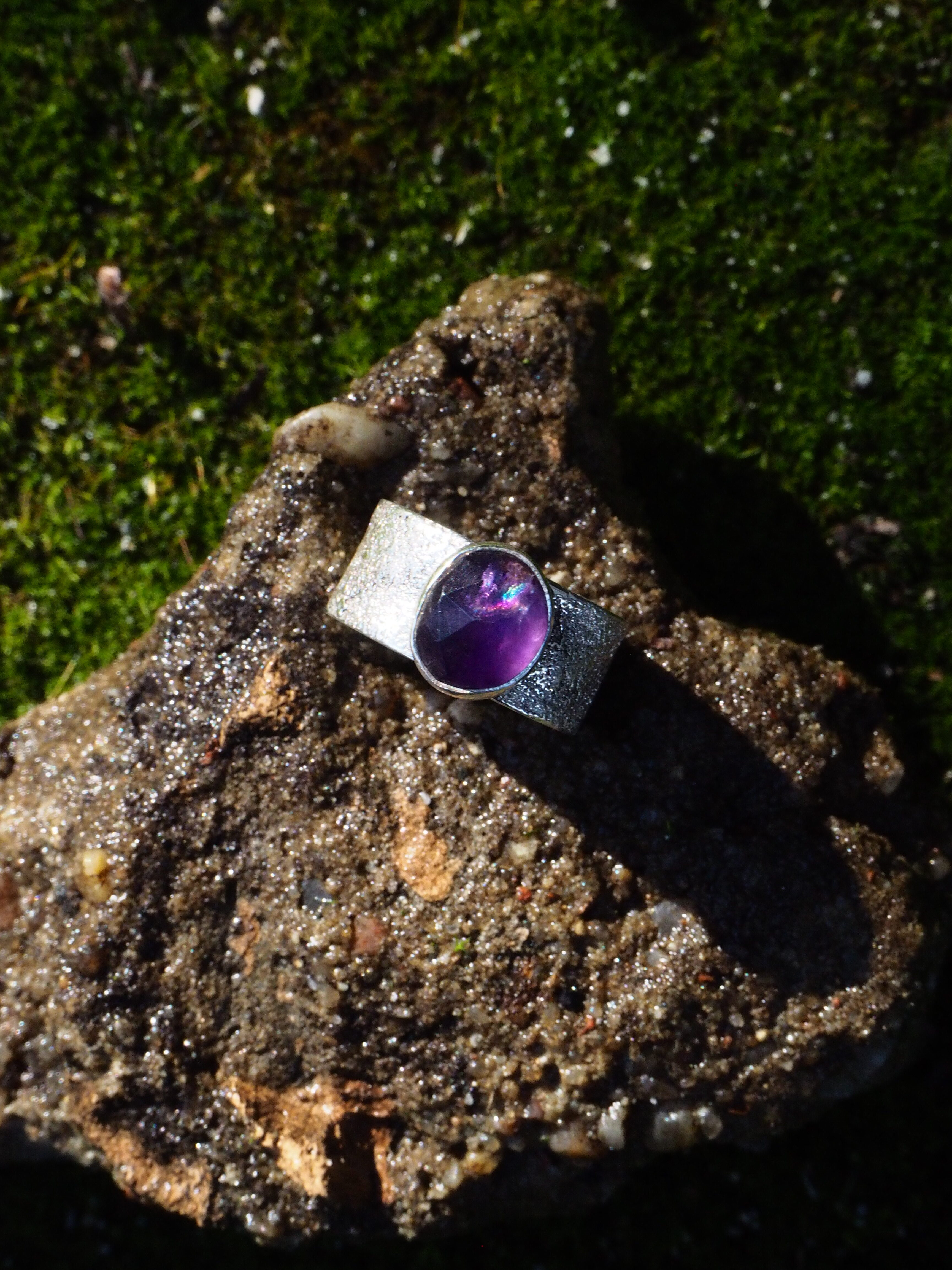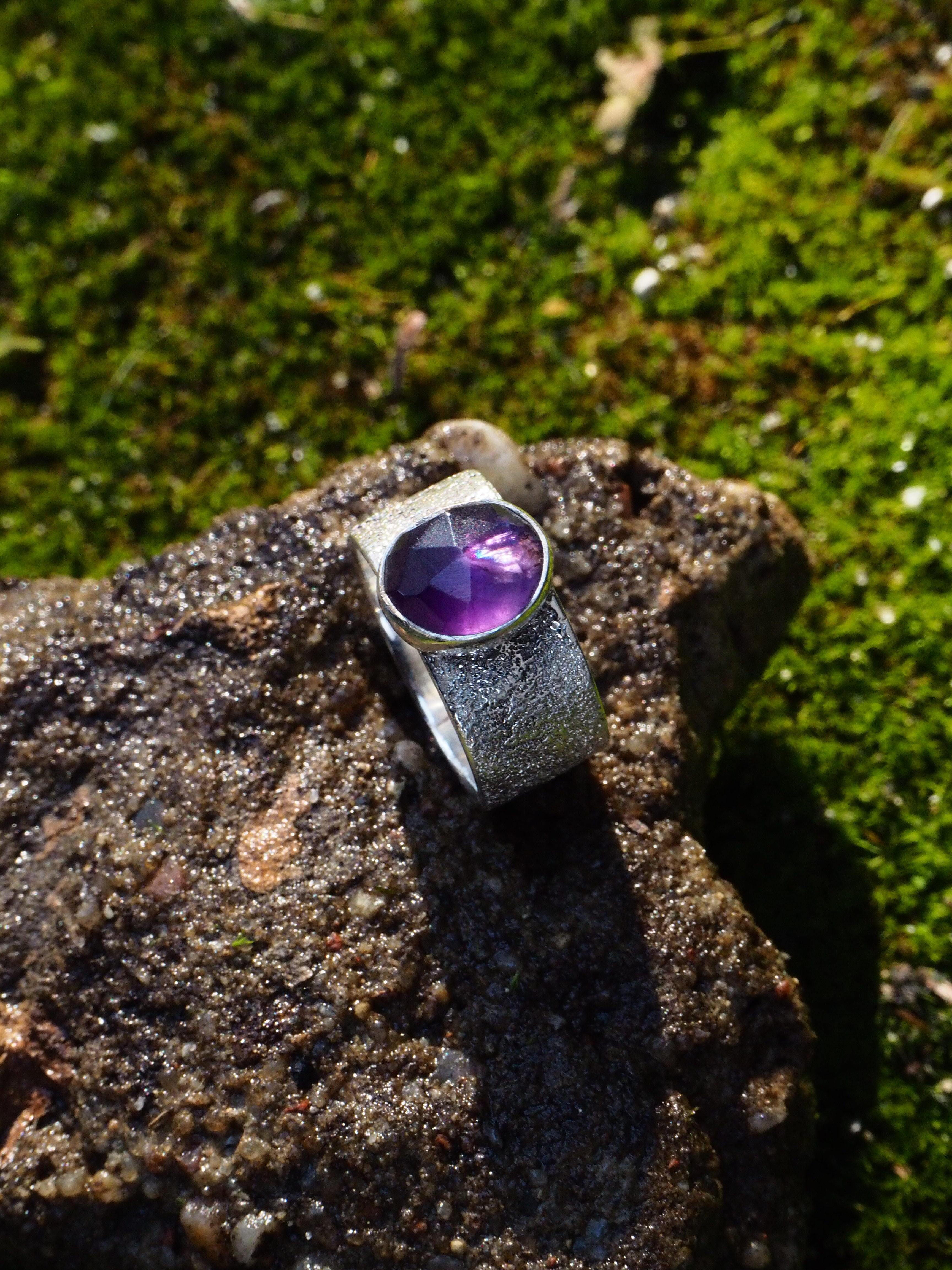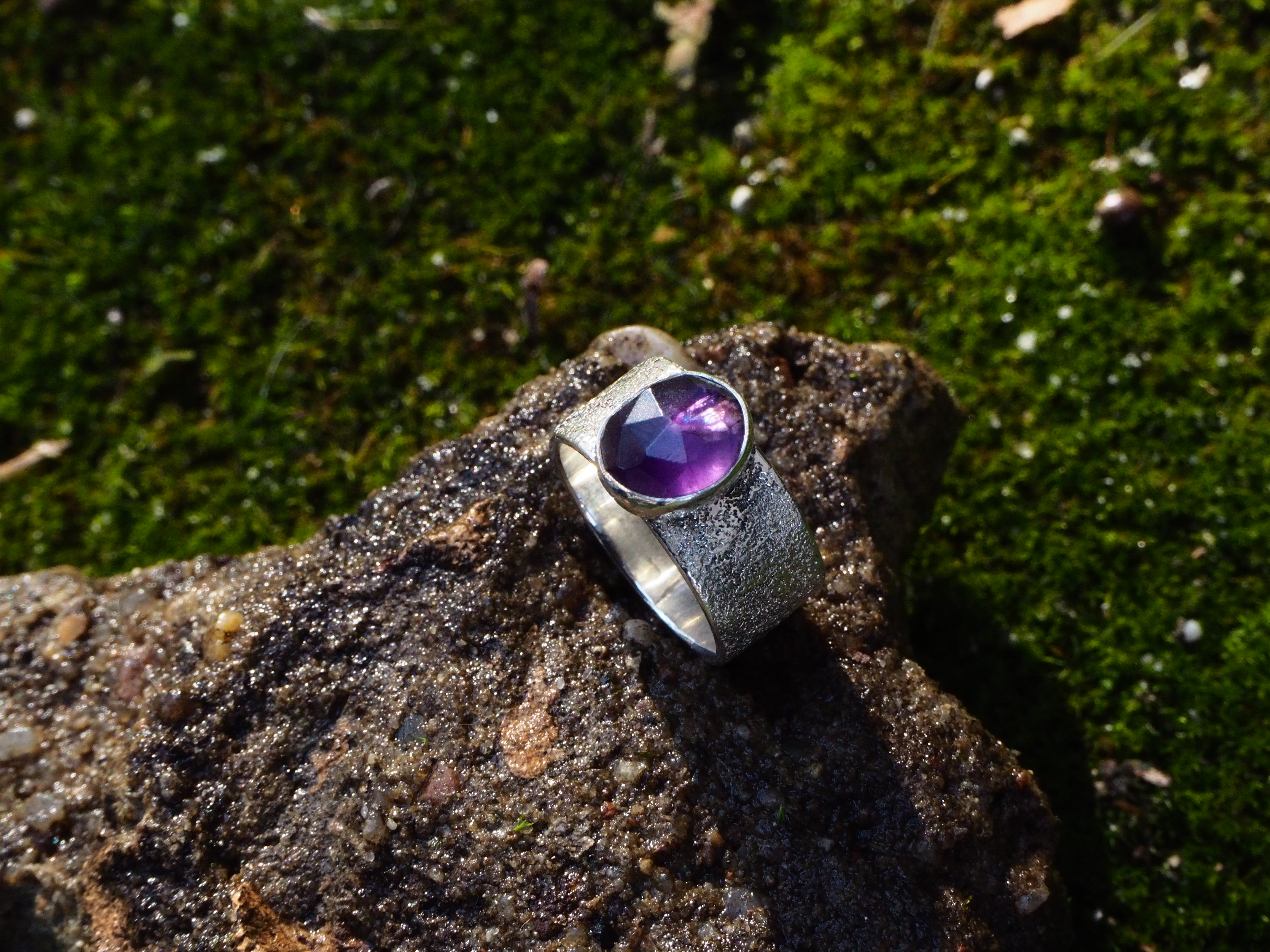 Wykonany ze srebra próby 925 pierścionek z fasetowanym ametystem. Obrączka pierścionka posiada ,,zmrożony” efekt, który dodaje uroku i charakteru. Obrączka szeroka, ma 8,5 mm. Pięknie wybarwiony ametyst w rozmiarze ok. 10 x 9 mm zakuty w pełną oprawę.