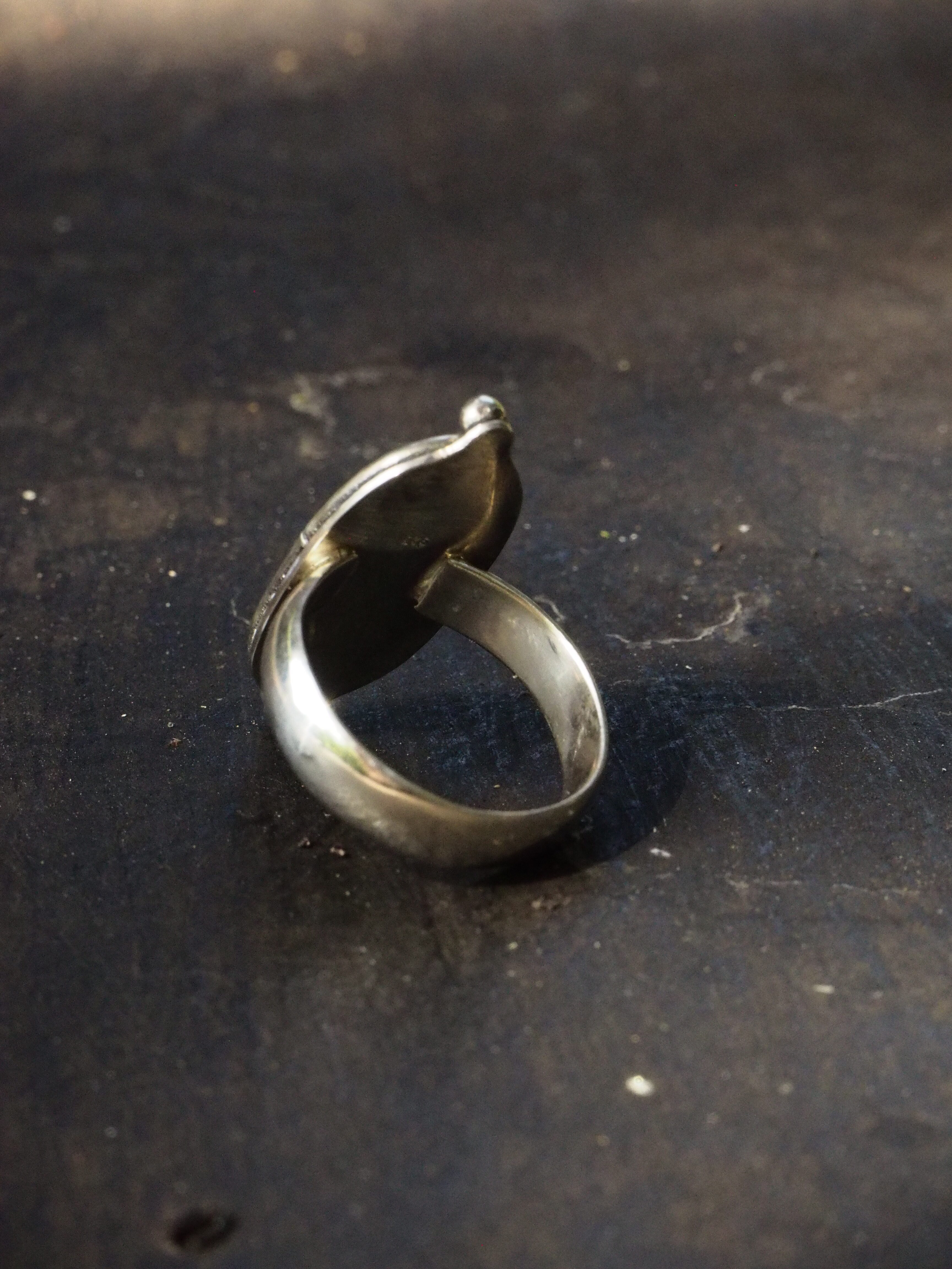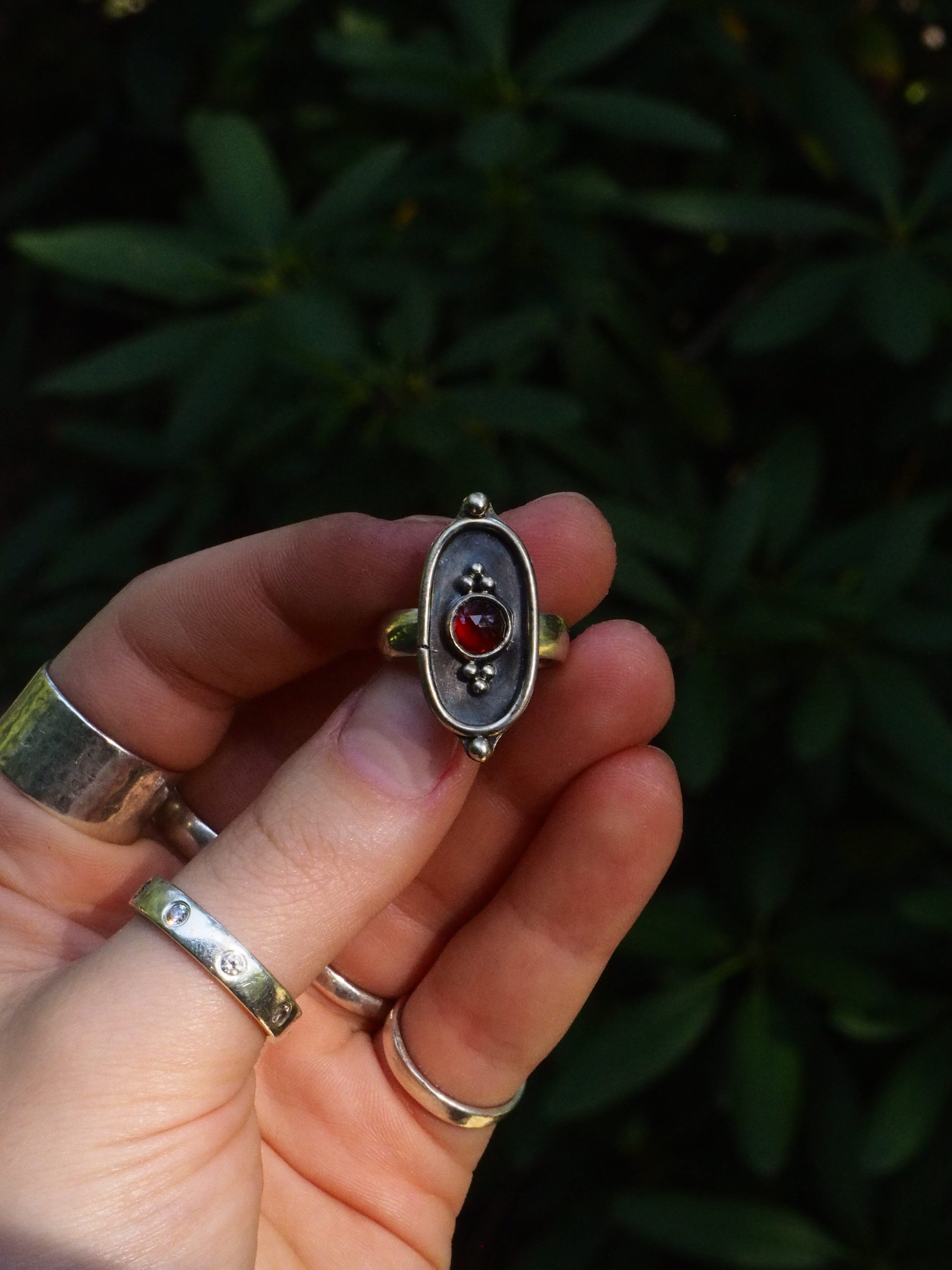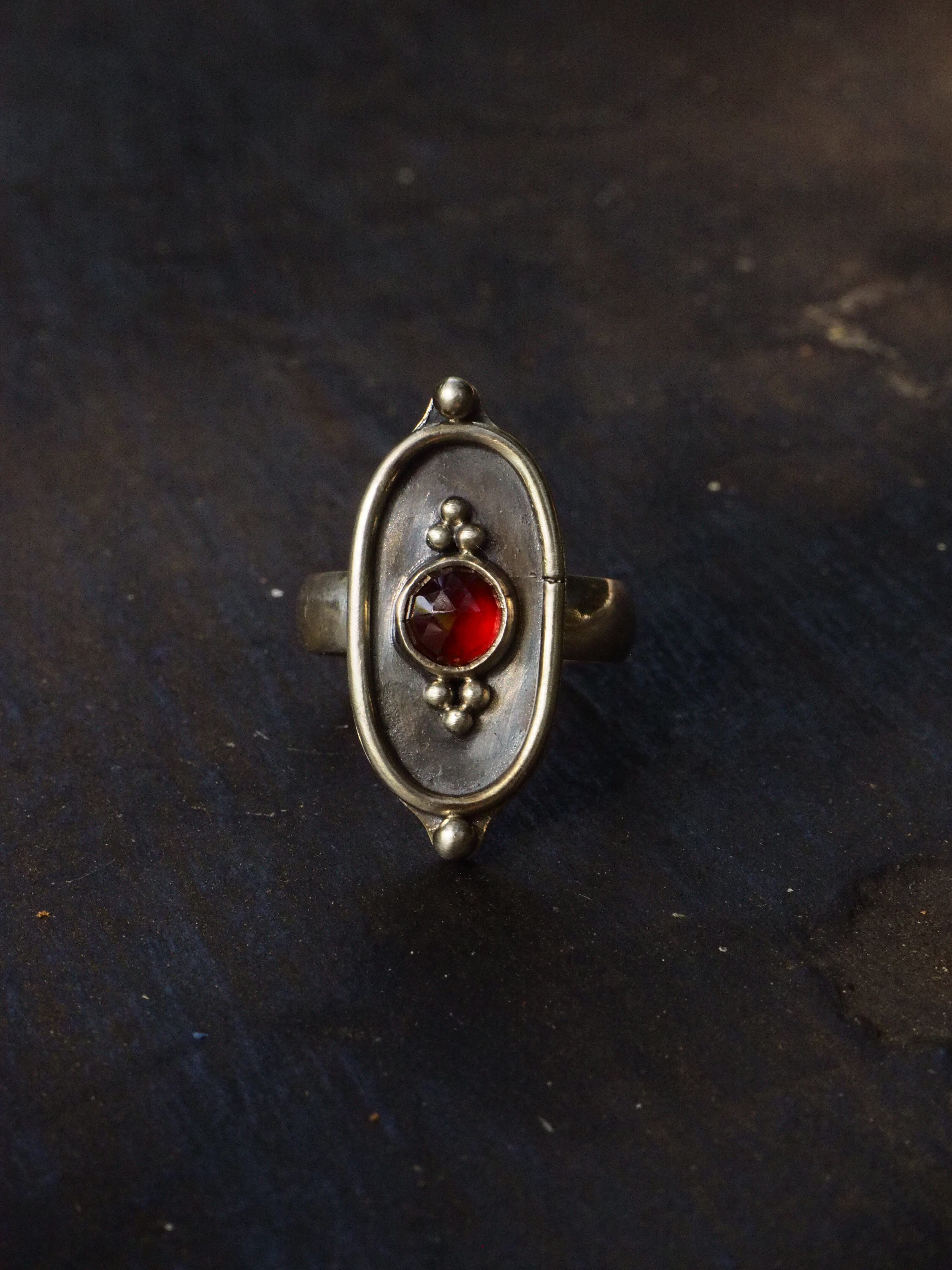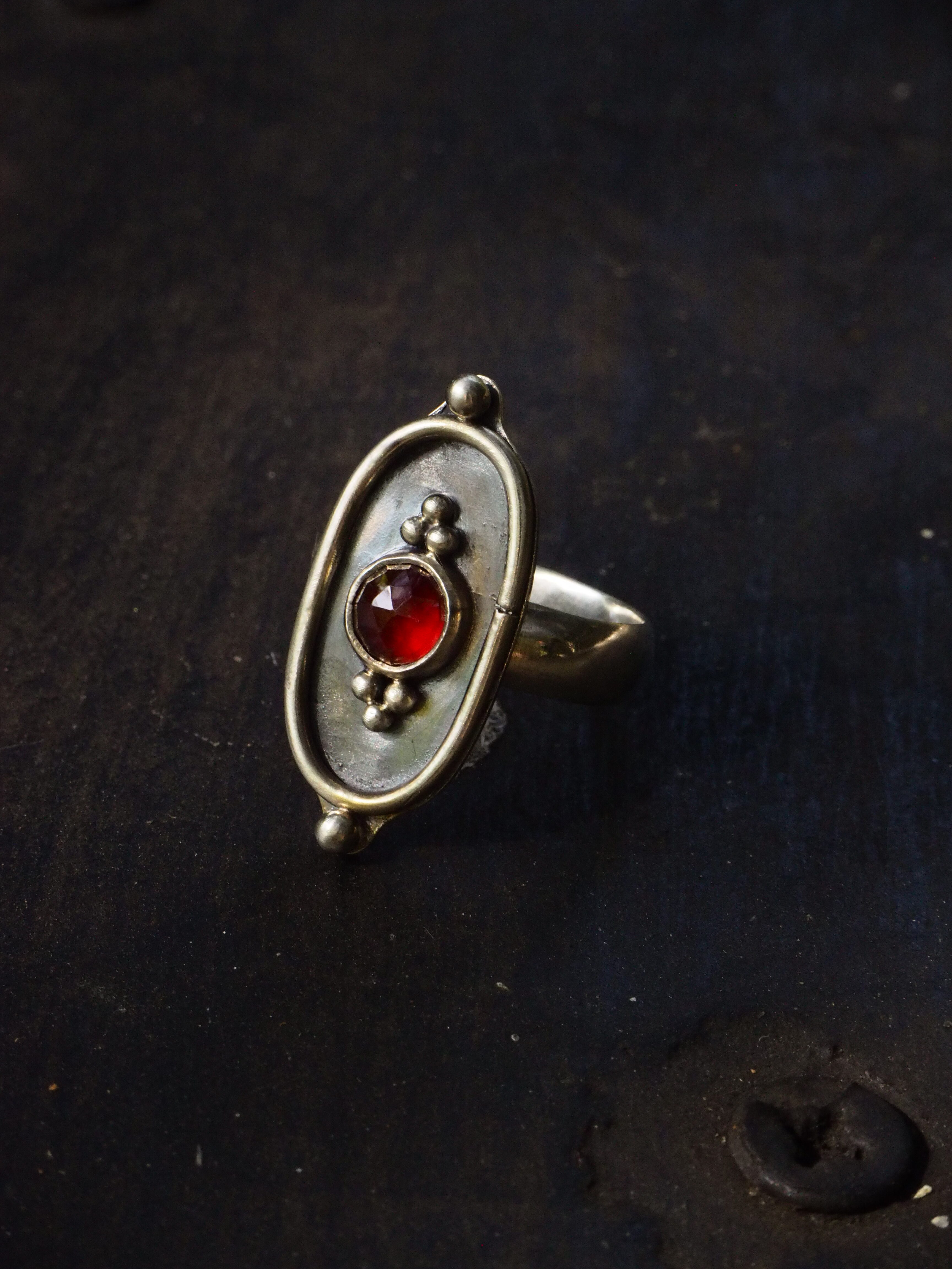Pierścionek ręcznie wykonany ze srebra próby 925. Na owalnej tarczy o wymiarach ok. 27 × 12 mm osadzony jest fasetowany granat o średnicy 7 mm – kamień o głębokiej czerwieni, który od wieków kojarzony był z energią i siłą życiową. Wokół niego rozmieszczone są srebrne kuleczki, tworzące symetryczny układ, a całość zamknięta jest w prostej, wyrazistej ramie. Obrączka półokrągła, gładka, w rozmiarze 16.